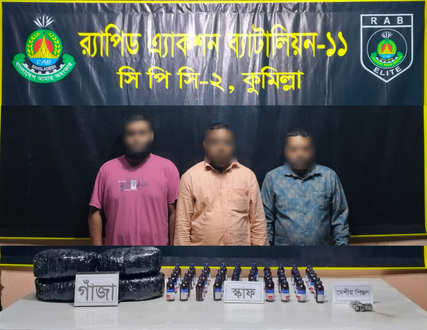 কুমিল্লা র‌্যাব-১১ ও সেনাবাহিনীর যৌথ অভিযানে অস্ত্র ও মাদকসহ গ্রেফতার ৩