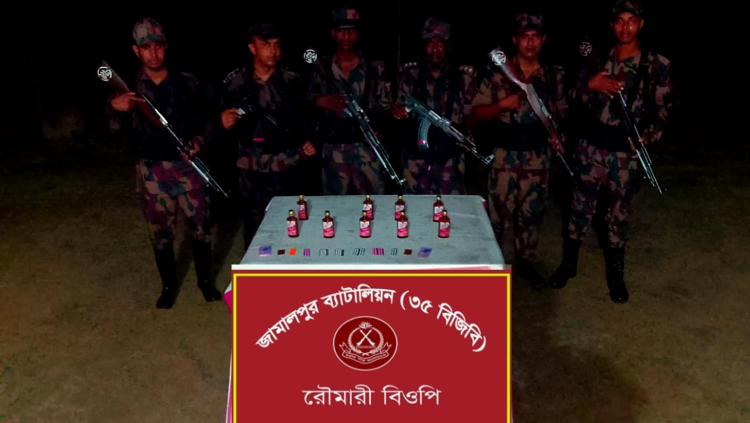 রৌমারীতে জামালপুর ব্যাটালিয়নের ৩৫ বিজিবি অভিযানে ভারতীয় ৯ বোতল মদ এবং ১৩৫০০ টাকা ভারতীয় ঔষধ সহ আটক
